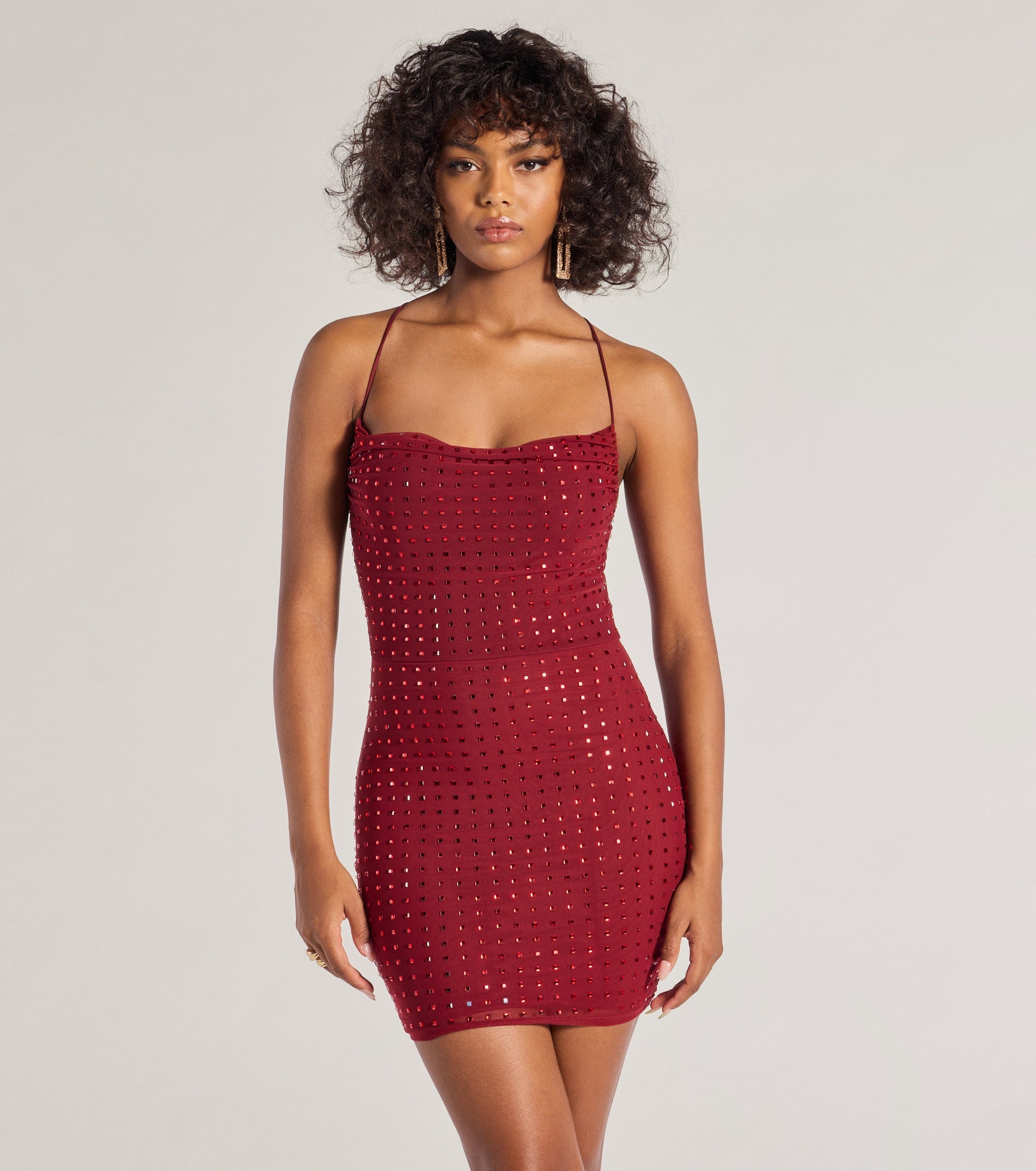 Glitz up the night like you the glam babe you are in this figure-flaunting mini dress designed with lined mesh fabric with all-over tonal rhinestone embellishments for a gorgeous sheen. It features a sleeveless cowl neckline, spaghetti straps that lead to an open back with a cross-back strappy design, and a short bodycon silhouette.